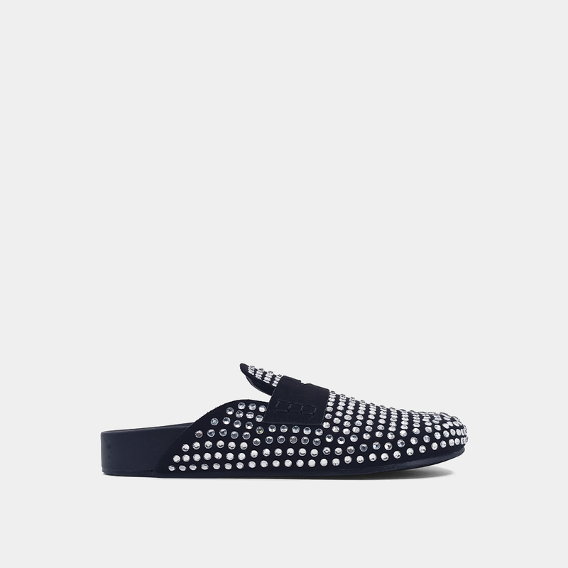 Meet TRACY - a chic pair of faux leather slippers adorned with stylish "rhinestones" and a suede body that gives off a trendy clogs vibe. These slippers come with a branded molded footbed, a comfortable round toe, an open-back slip-on style, and a durable flat rubber sole. Their versatile design makes them a perfect match for jeans or miniskirts, adding a touch of glamour to any outfit.