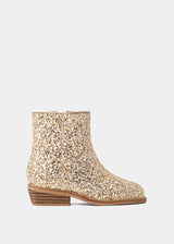 This one’s for the tiny trendsetters. VANILLA MINI in Gold Sparkle is a glam boot made to shine bright on every step. Covered in golden glitter with a low stacked heel and easy pull-on silhouette, it’s the kind of shoe that turns errands into catwalks. Whether it's dress-up day or just because, this is sparkle without the scratch.