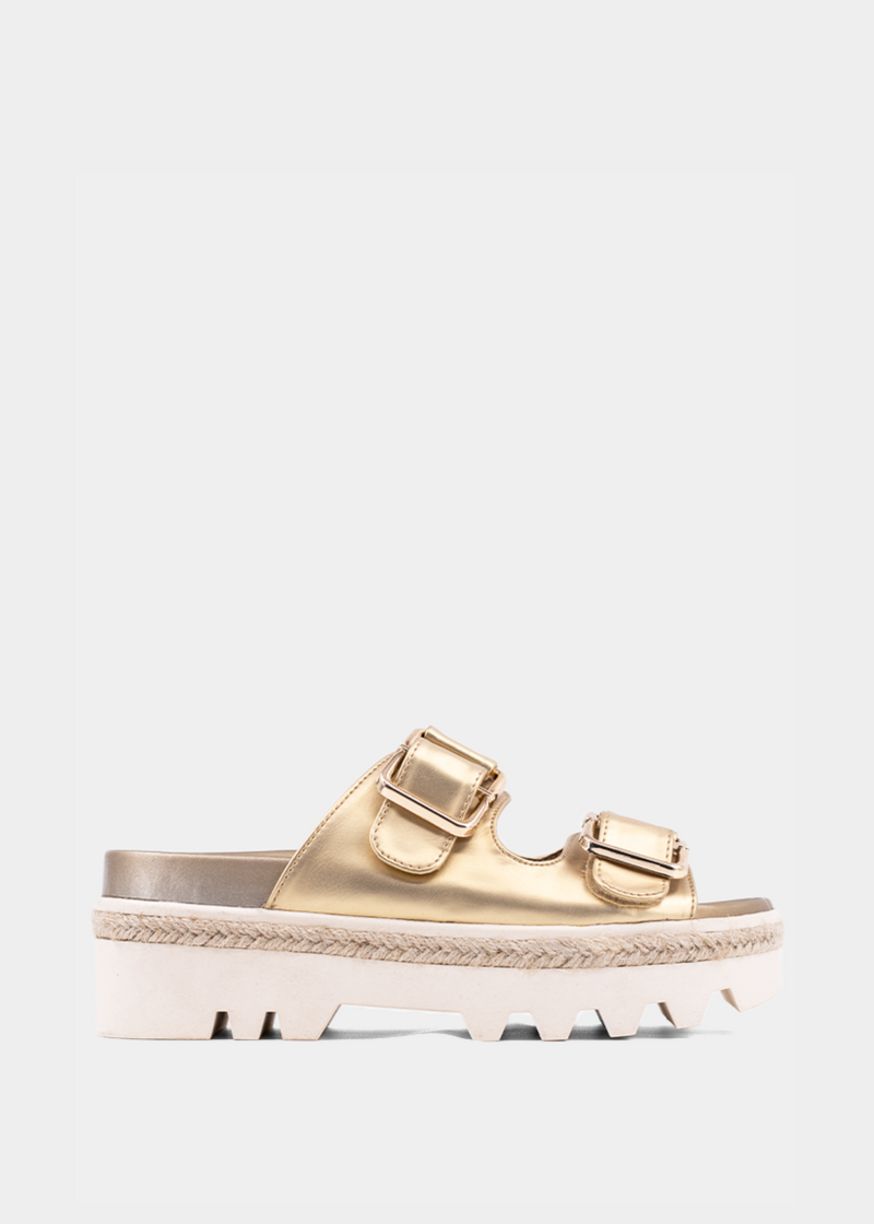 Step into effortless style with XYLA, the perfect blend of fashion and function. Featuring a pin-buckle fastening and slip-on design, it's your go-to for easy elegance. The lightweight elastic outsole and molded footbed ensure all-day comfort, while the buttery faux metallic leather adds a luxe touch. Complete with a rope-detailed outsole, this flatform sandal is the ultimate chic-meets-casual piecejust pair it with your favorite dress, skirt, or denim!