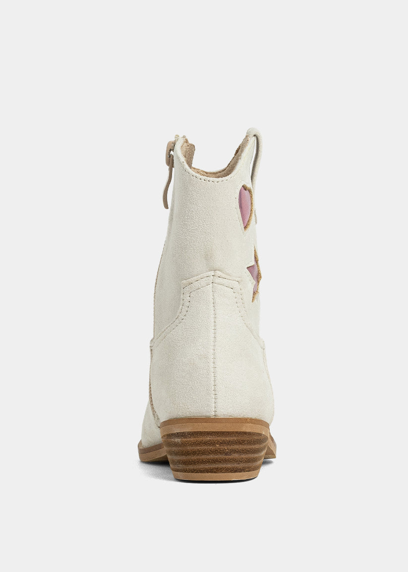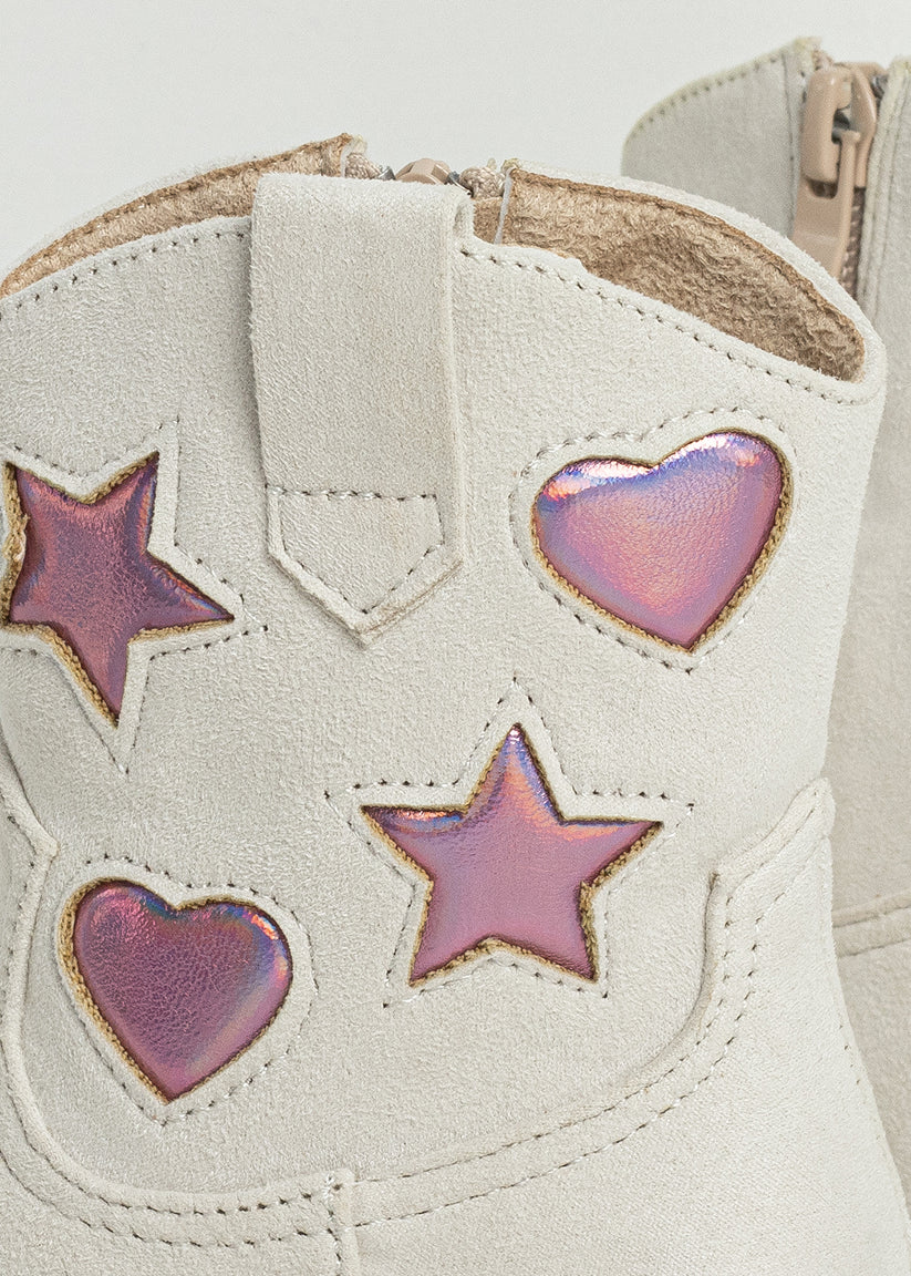 For the little star in your life: the ZIMBA MINI in Light Grey Suede is where western charm meets playful glam. Designed with a soft faux suede upper in a versatile light grey tone, this boot stands out with iridescent pink heart and star appliqués that shimmer with every step. A stacked heel and easy side zipper offer comfort and practicality, making it perfect for twirls, trots, and everything in between.