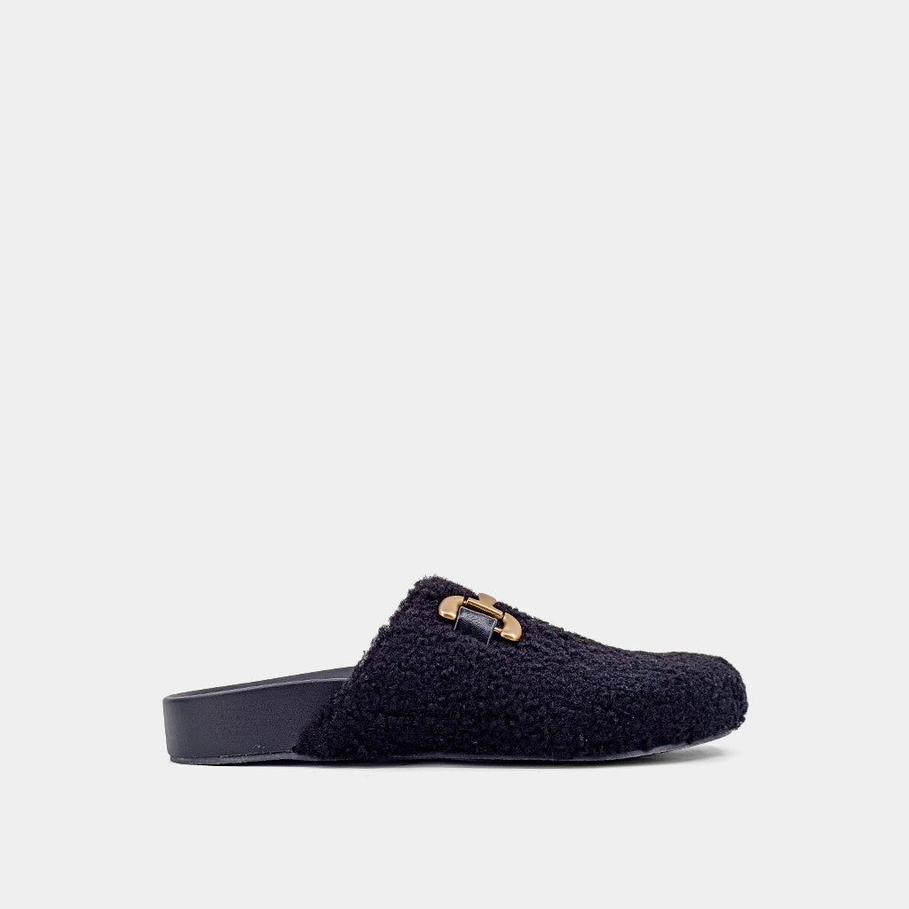 Introducing AZALEA: the epitome of fashionable slippers that exude a trendy clogs vibe. With a branded molded footbed, a comfortable round toe, an open-back slip-on style, and a durable flat rubber sole, they are crafted from a luxurious combination of textiles, faux leather, suede, and lambskin. The versatile design, complemented by a metal chain detail, makes them the perfect complement to jeans or skirts, adding a touch of comfort and style to any outfit.