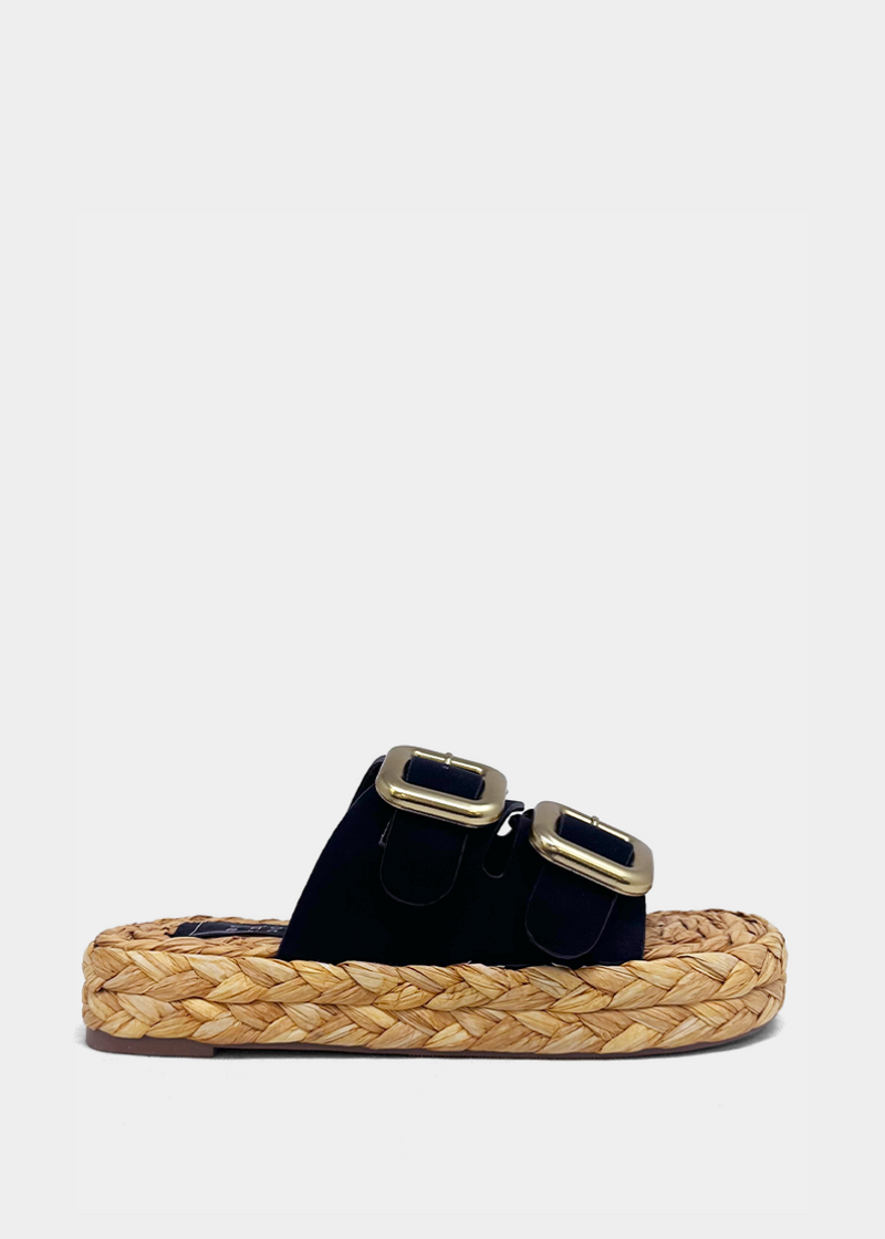 Sleek, bold, and effortlessly chic the BILLIE in Black is a statement sandal designed to stand out. Luxe faux leather straps meet gleaming gold-tone buckles for a striking contrast, while the woven jute sole adds an unexpected natural twist. A subtle wedge effect gives just the right amount of height, making this pair as flattering as it is comfortable. From daytime cool to evening glam, this sandal does it all.