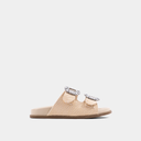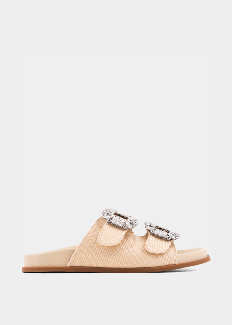 A statement slide with a touch of glamour. BRIDGET Bone Woven is all about laid-back luxury. Featuring a woven raffia upper, this effortless slip-on brings texture and elegance together. The crystal-embellished buckles add the perfect dose of sparkle, while the molded footbed ensures all-day comfort. Finished with a lightweight rubber sole, it's your new go-to for relaxed sophistication.