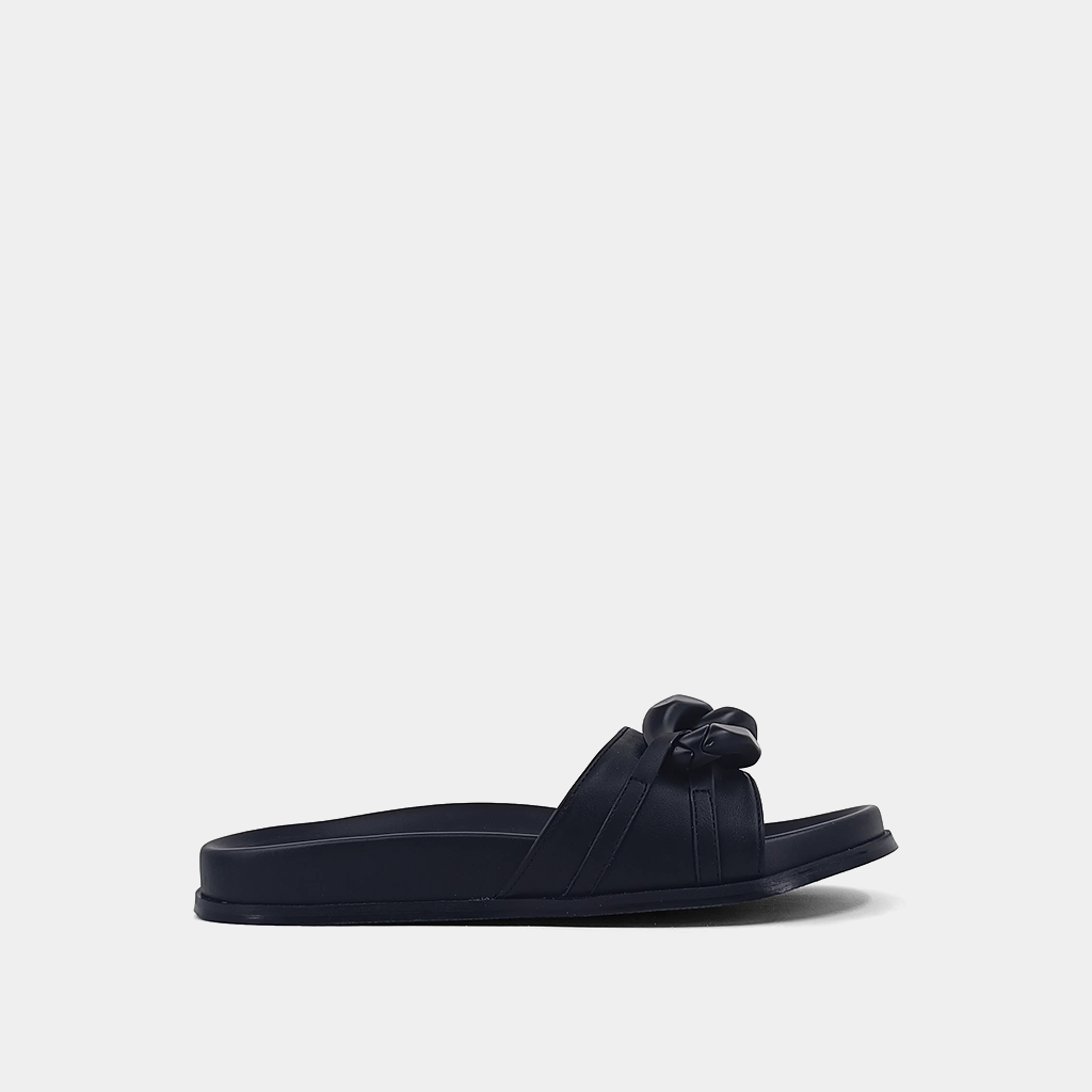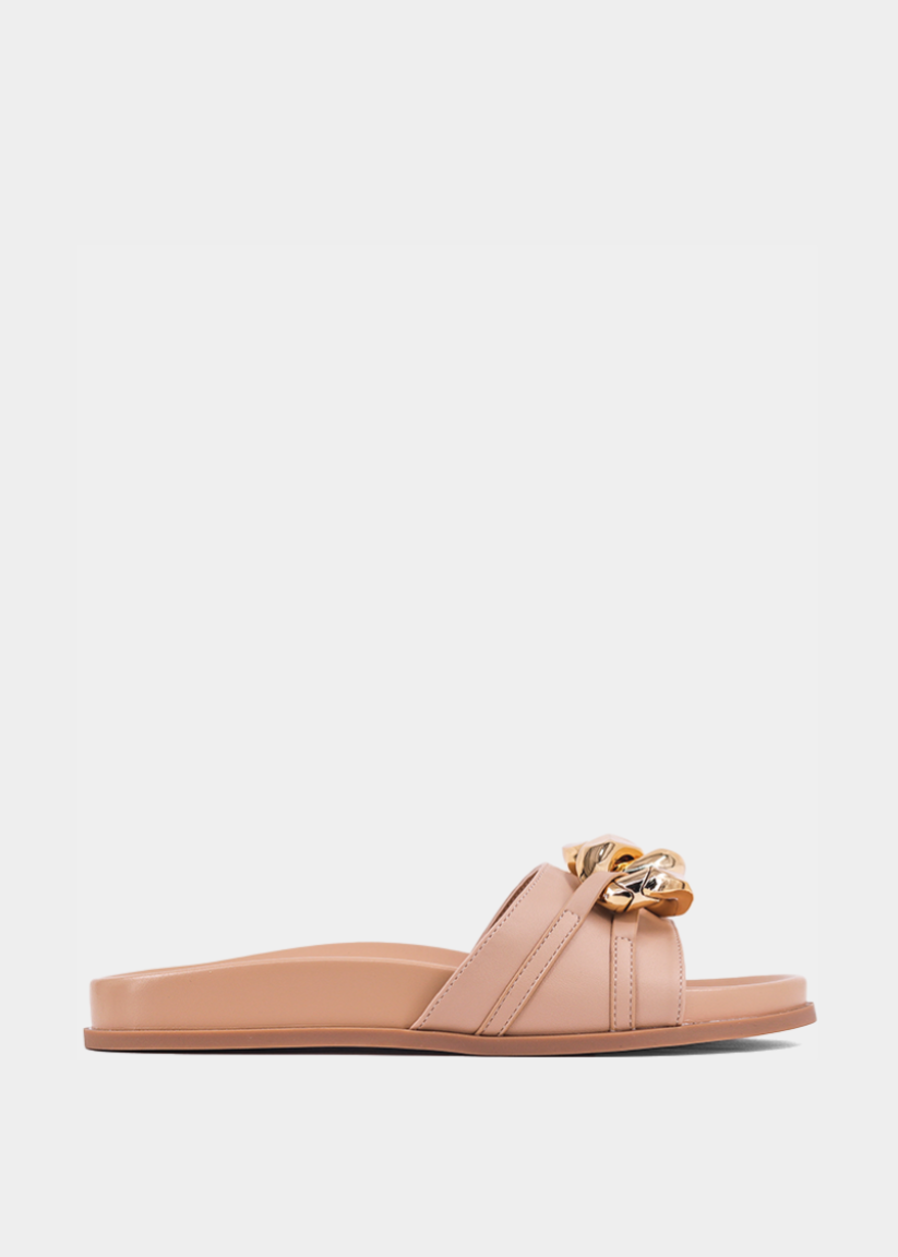 A beautifully designed slip-on sandal with a molded insole, crafted from luxurious faux leather and adorned with a metal knot-look buckle ornament. Don't forget to pack these for your summer getaway!