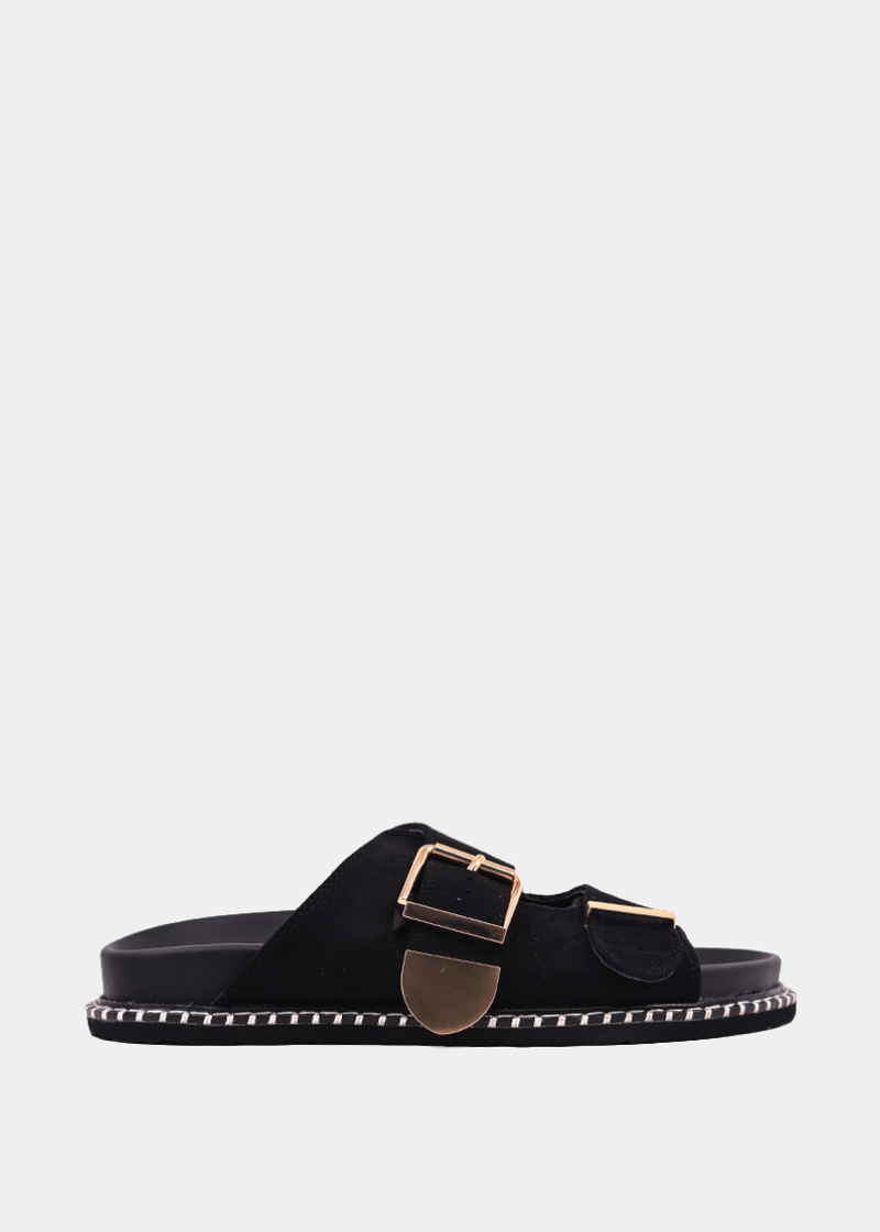 Meet the CHARLOTTE sandal in rich black suede, featuring dual wide straps with gold-tone buckles and shield accents for a touch of sophistication. A contrast-stitched sole adds flair, while a cushioned footbed ensures all-day comfort. Effortlessly chic, the CHARLOTTE is perfect for elevating any outfit.