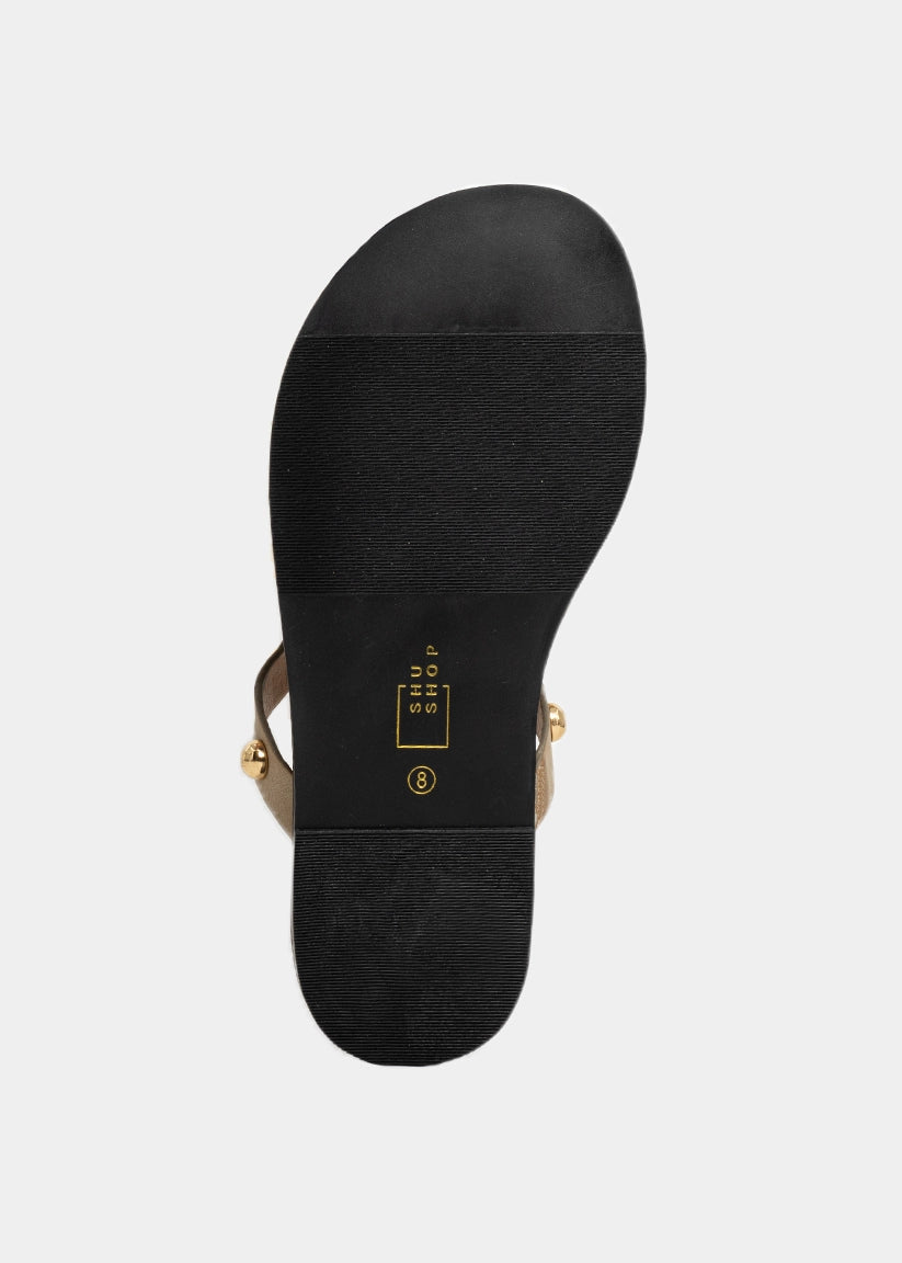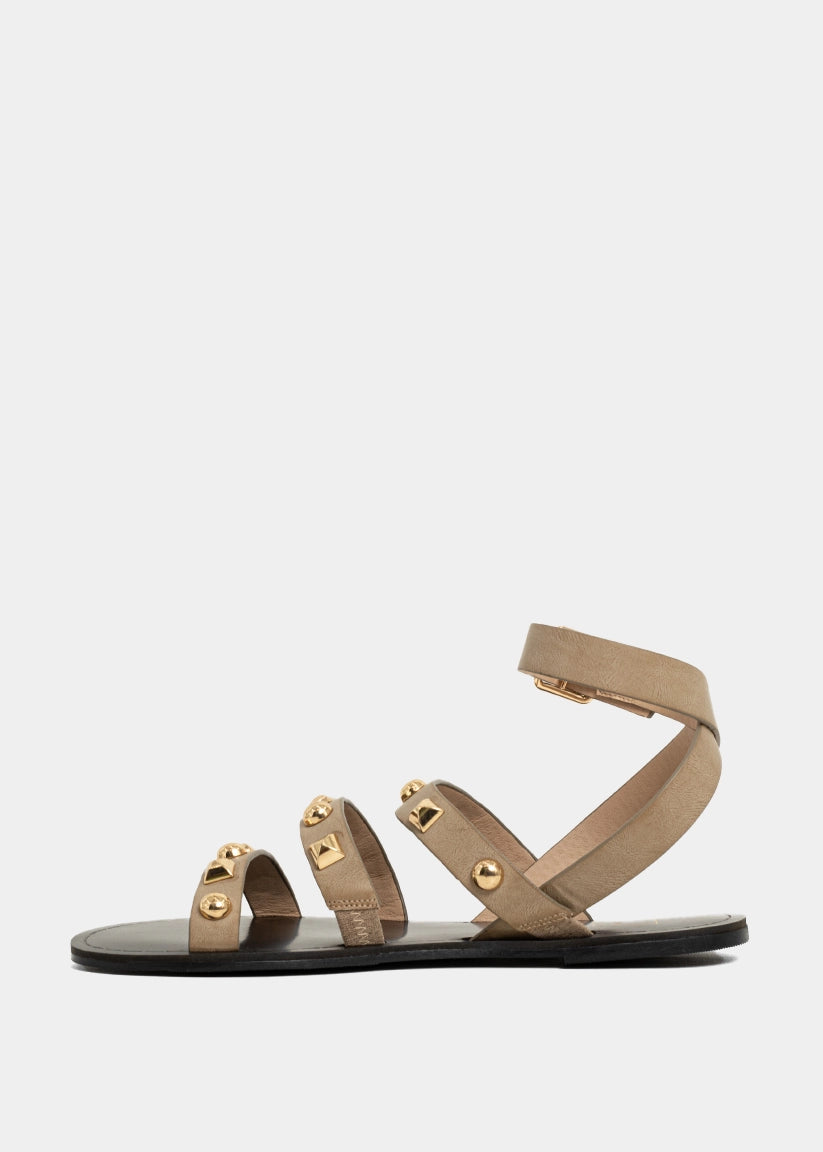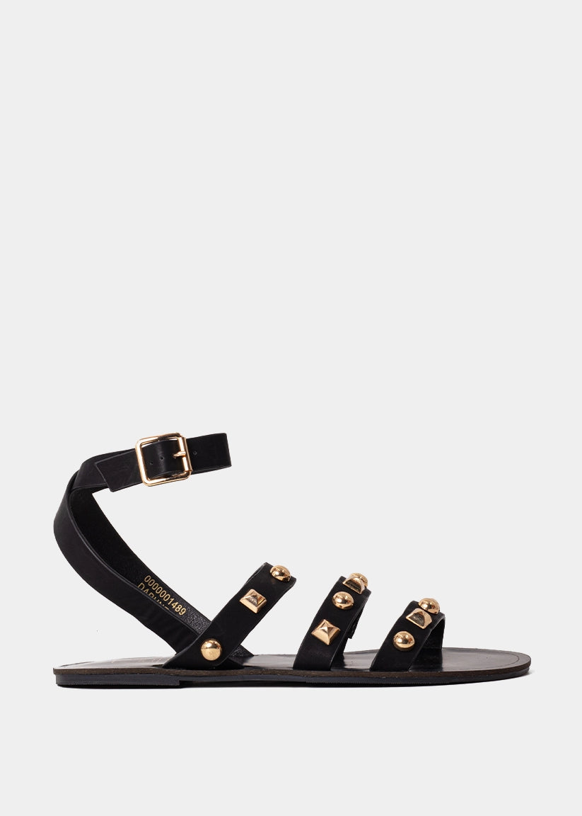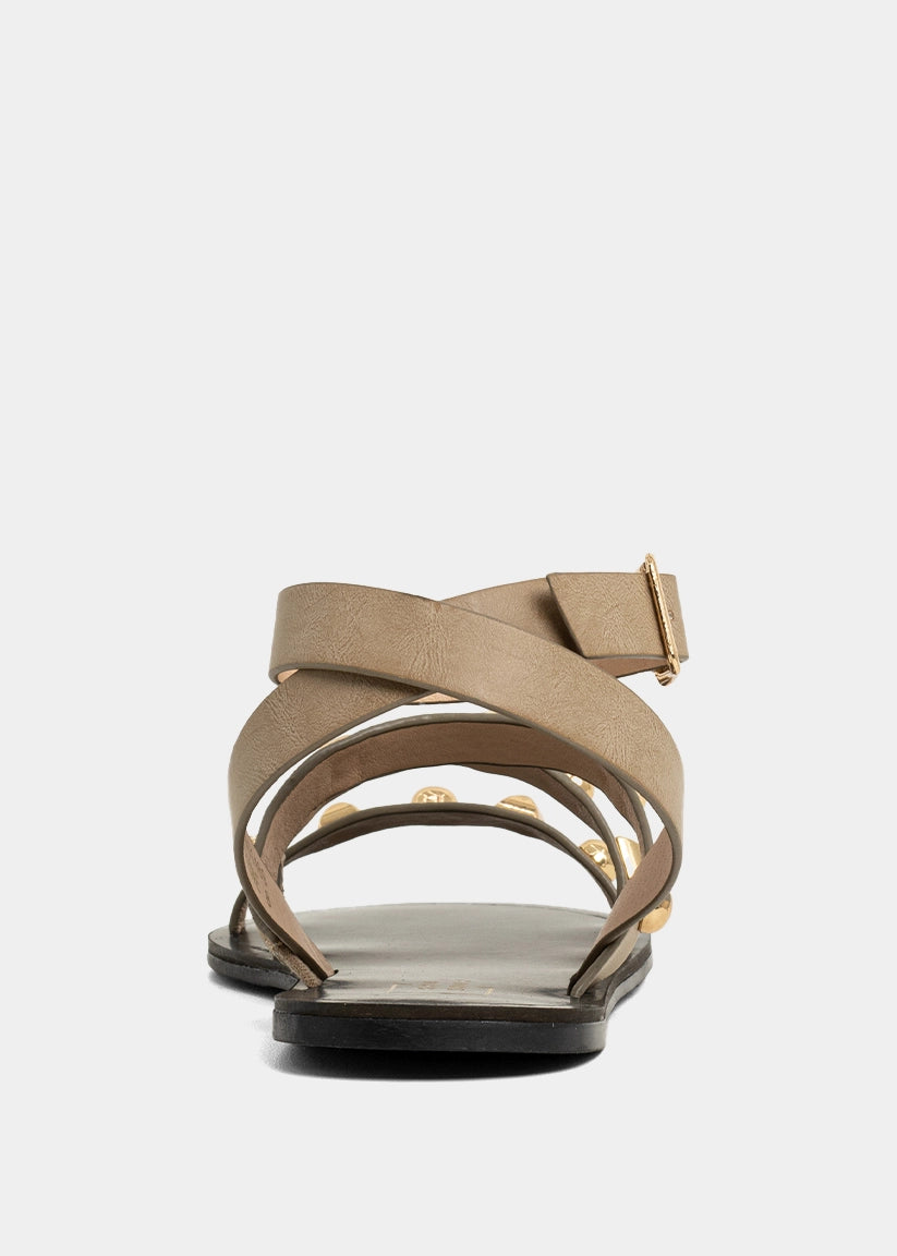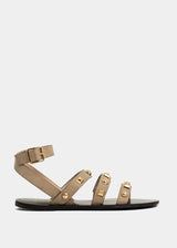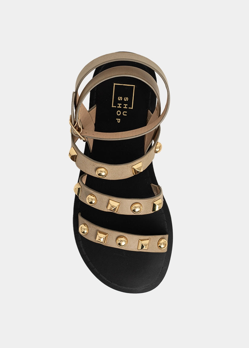 Sleek, strappy, and subtly bold. The DAPHNE in Taupe brings modern gladiator vibes in a neutral tone that goes with everything. Featuring matte gold-tone studs, an adjustable ankle strap, and a clean faux leather finish, this flat sandal delivers easy edge and everyday comfort. It’s that effortlessly cool staple you’ll want to pack for every warm-weather escape. Neutral never looked so striking.