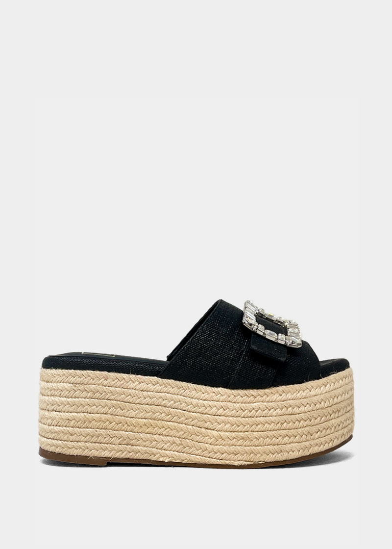 Classic meets statement-making with the KELLY in Black. Its woven-textured upper and dazzling crystal-embellished buckle give a bold, luxe feel, while the jute-wrapped platform-wedge hybrid delivers effortless height with a laid-back touch. Perfectly balancing comfort and glam, these sandals will take you from daytime chic to evening elegance in a heartbeat.