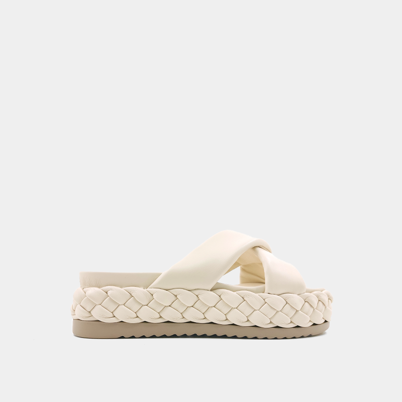 KIMORA features a striking flatform covered in faux leather and finished with an eye-catching chunky braid. The criss-cross upper straps and cushioned insoles will help keep your look grounded and comfy.
