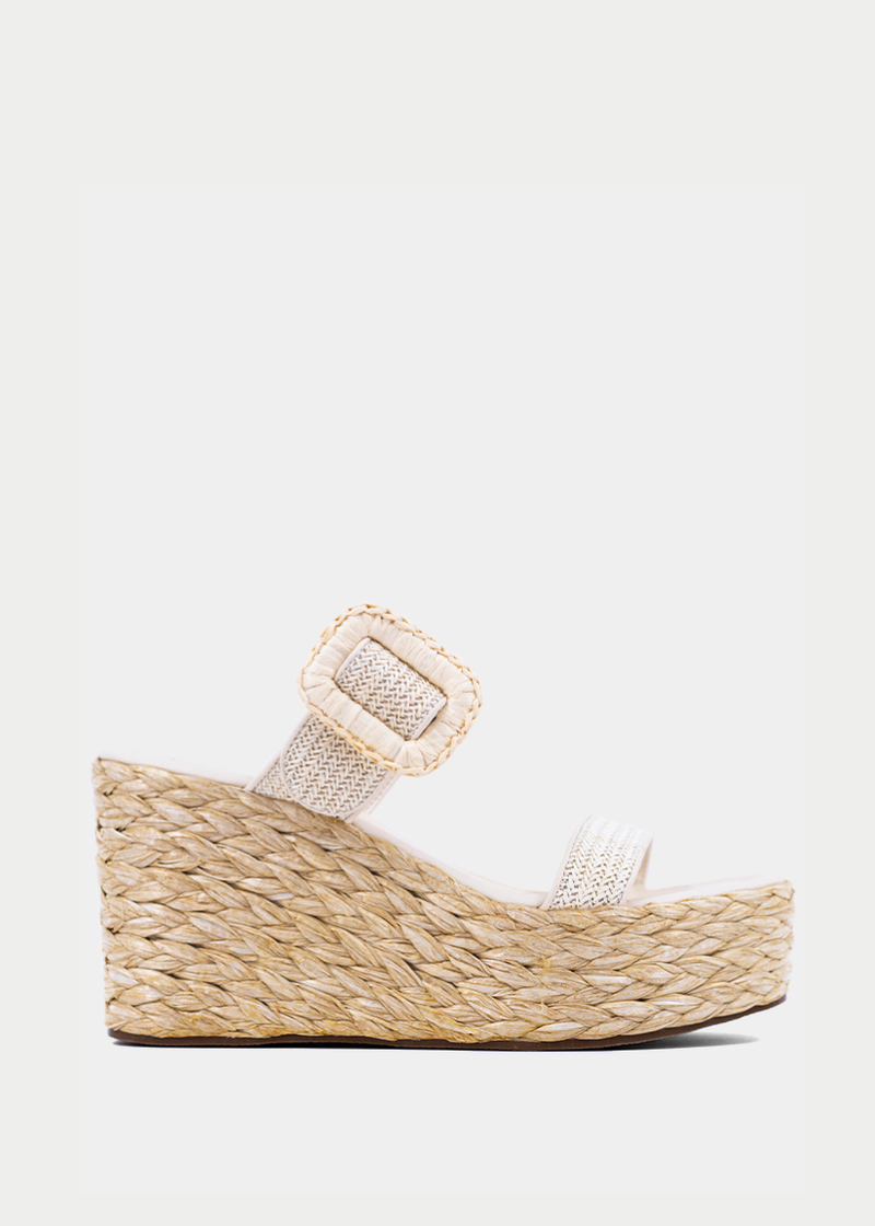 Meet LEENA in Bone, a stunning mix of texture and style! Featuring woven raffia mesh and faux leather straps paired with raffia soles, it blends natural charm with modern sophistication. The bold buckle adds a statement touch, while cushioned footbeds ensure comfort with every step. A must-have for effortless, year-round elegance!