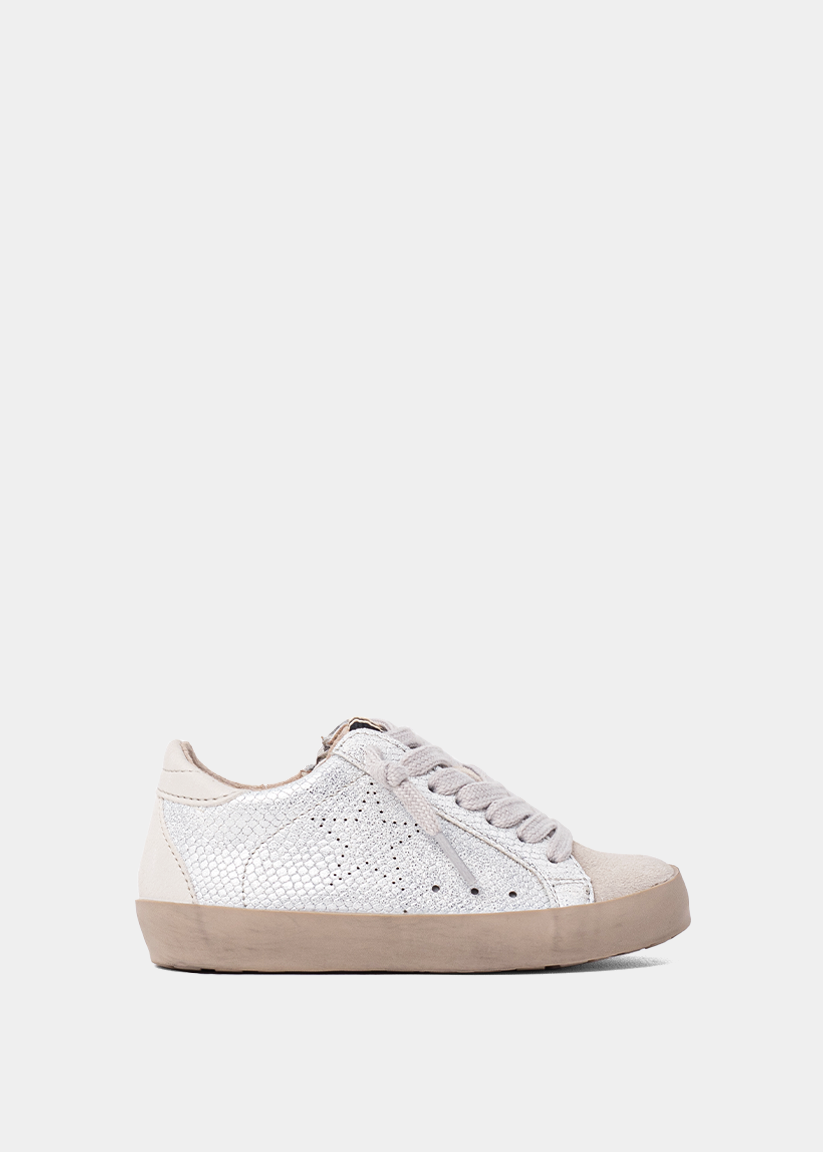 Check out our Mommy and Me collection! It features cute, scaled-down versions of our best-selling sneakers for you and your little one. MIA is a vintage-inspired sneaker made of high-quality metallic-silver faux leather and suede, with a sturdy sole and textured panels. It's versatile and can be paired with any outfit..