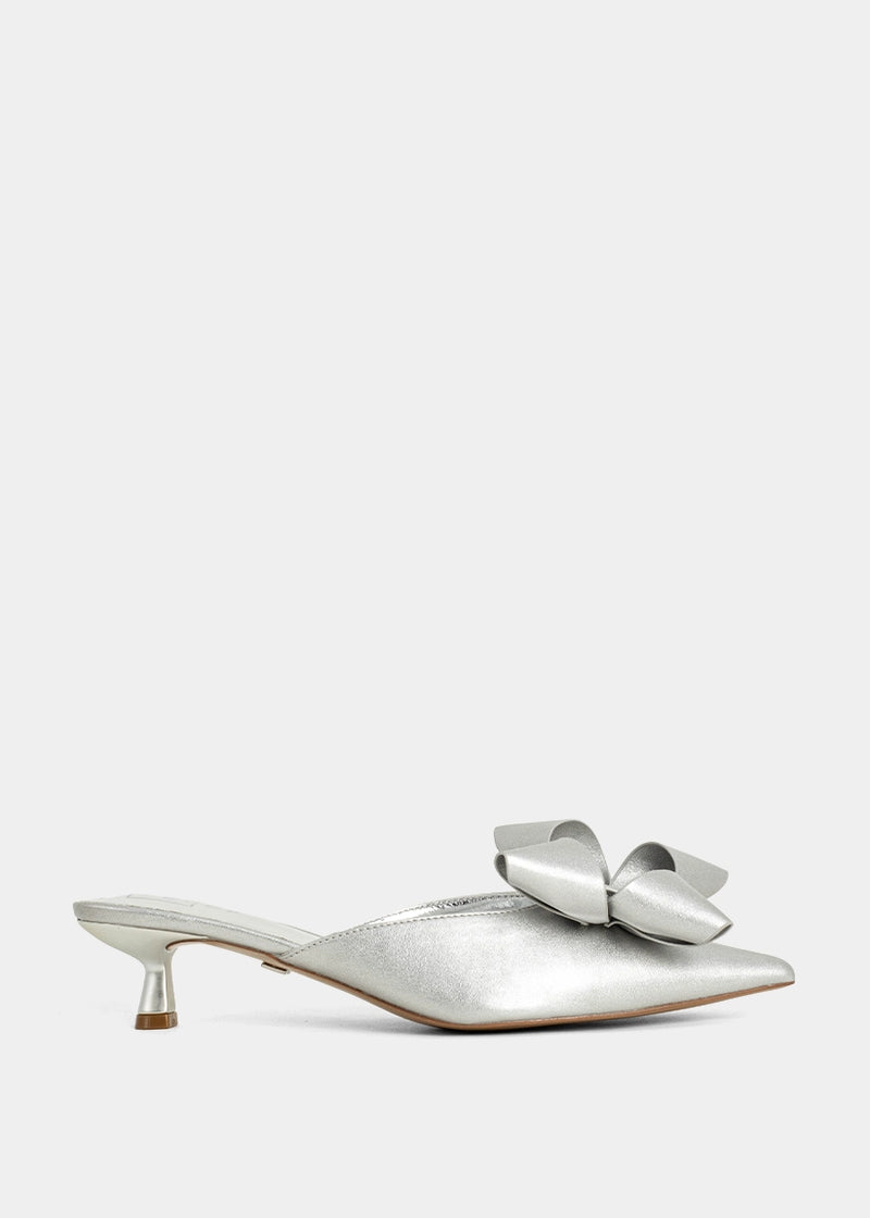 Chic, sleek, and a little bit glam. NELL in Silver brings a playful shine to your heel lineup with its pointed toe, sculptural bow, and modern kitten heel. A slip-on style that goes from dinner to dance floor without skipping a beat.
