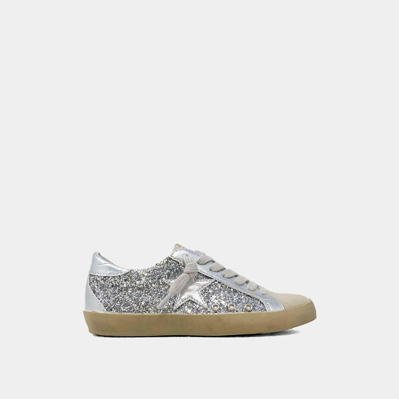 The PAULA sneaker for kids combines vintage charm with a modern twist. Designed with a round toe and a sturdy rubber sole, these sneakers offer both comfort and durability for little feet. Made from high-quality synthetic leather and suede, the shoe features fun silver glitter embellishments and a grey star detail. With its versatile style and all-day comfort, the PAULA sneaker is perfect for both playtime and outings!