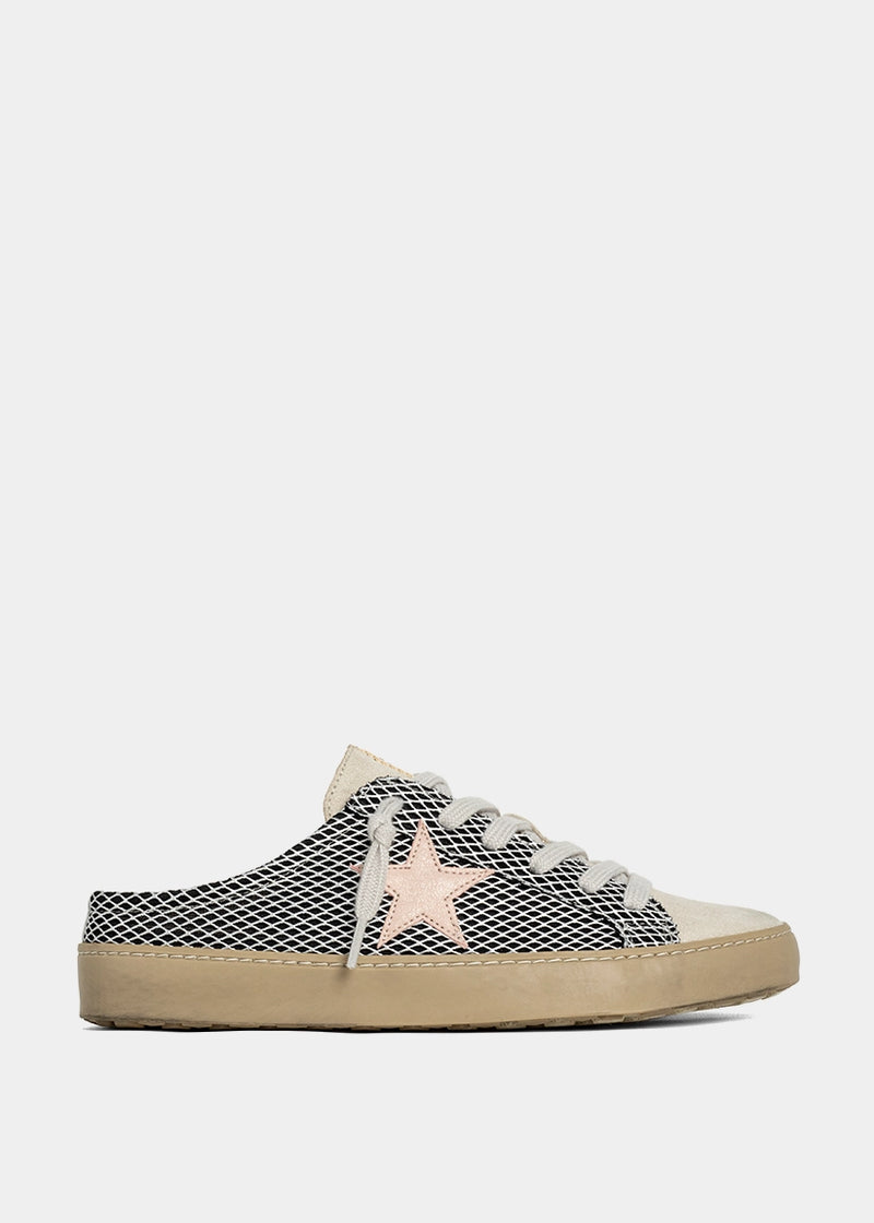 Shimmer with every step. The POLKA Metal mule sneaker stands out with its textured black-and-silver upper, blush pink star, and laid-back silhouette. From city strolls to weekend plans, it's your new power slip-on.