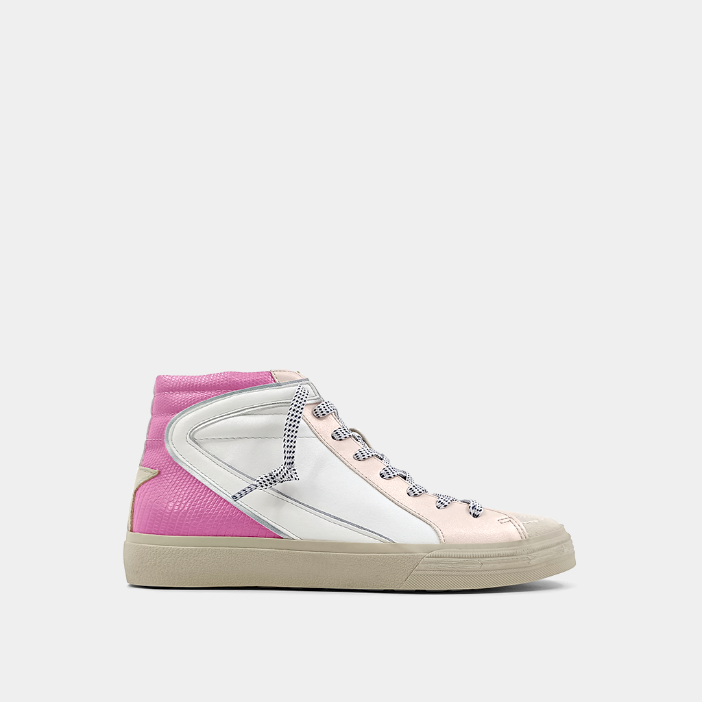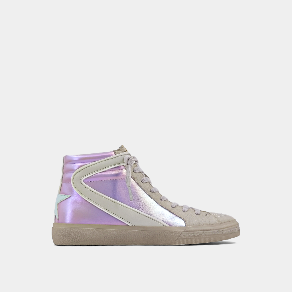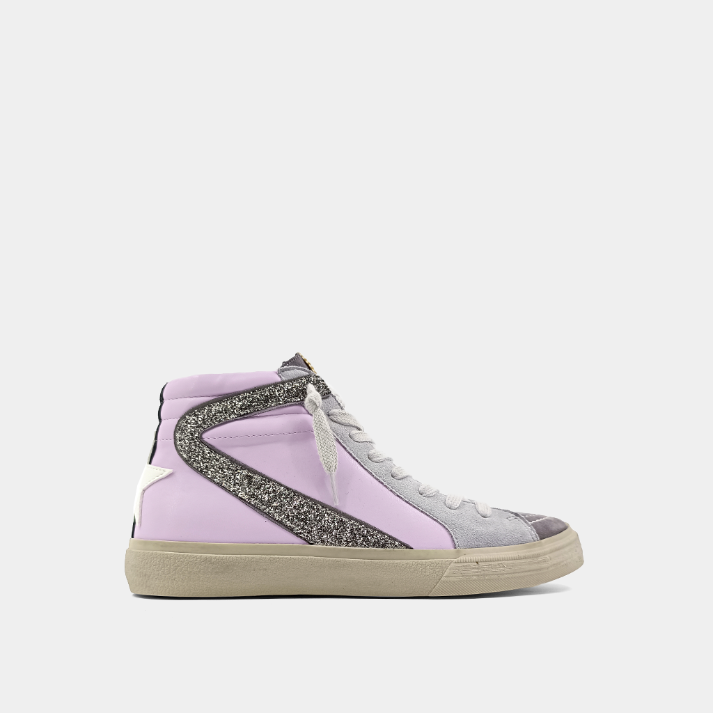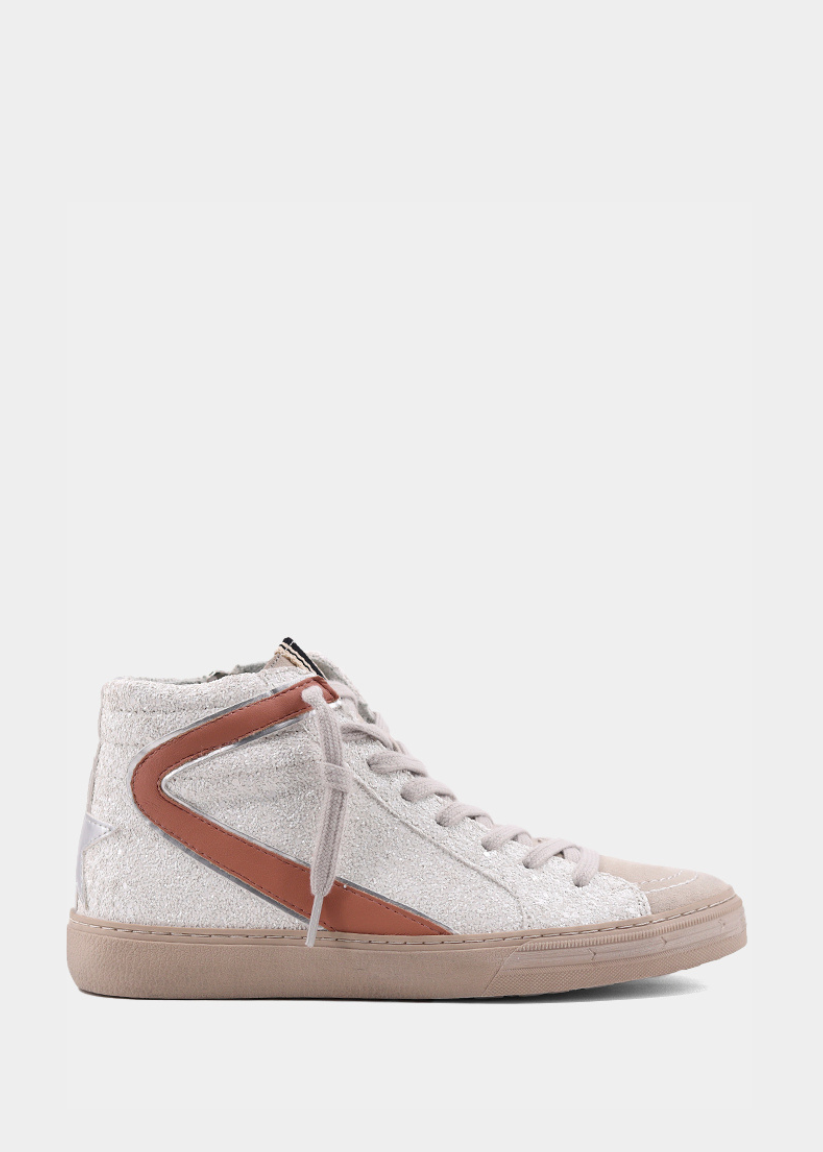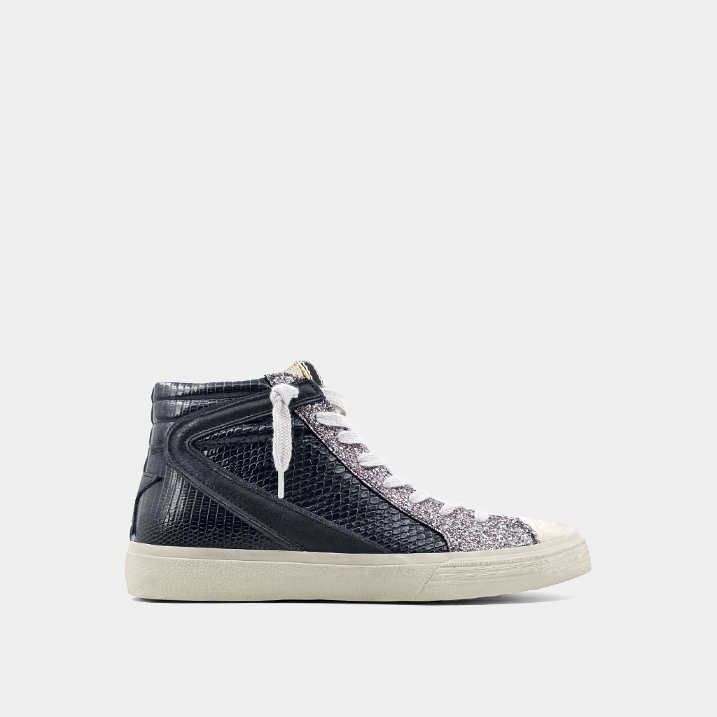Our ROONEY high-top sneakers are a tribute to classic basketball shoes. They feature metallic faux leather, vibrant glittery accents, and a comfortable fit. The colorful detailing adds a playful element. These high-tops are versatile and can be paired with anything from casual skirts to sporty track pants or formal clothing, adding a unique touch to any outfit.