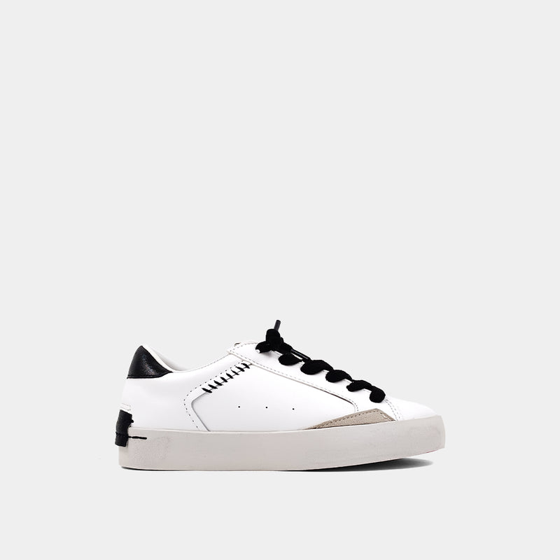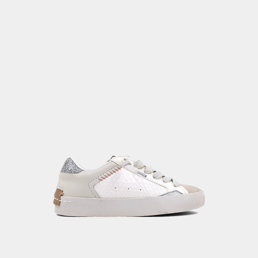 Your kids deserve to be as cool as you are! RUBY won't disappoint. It's a stylish and contemporary low-top sneaker made of textiles, buttery faux leather (including artificial suede), a white body, and beige and black colors paired with modern, minimalist black stitching details. The design is visually clean and includes distressed patches for a cool twist. The rubber soles are designed for long-lasting comfort and support, perfect for all-day wear. Timeless appeal and superior craftsmanship.