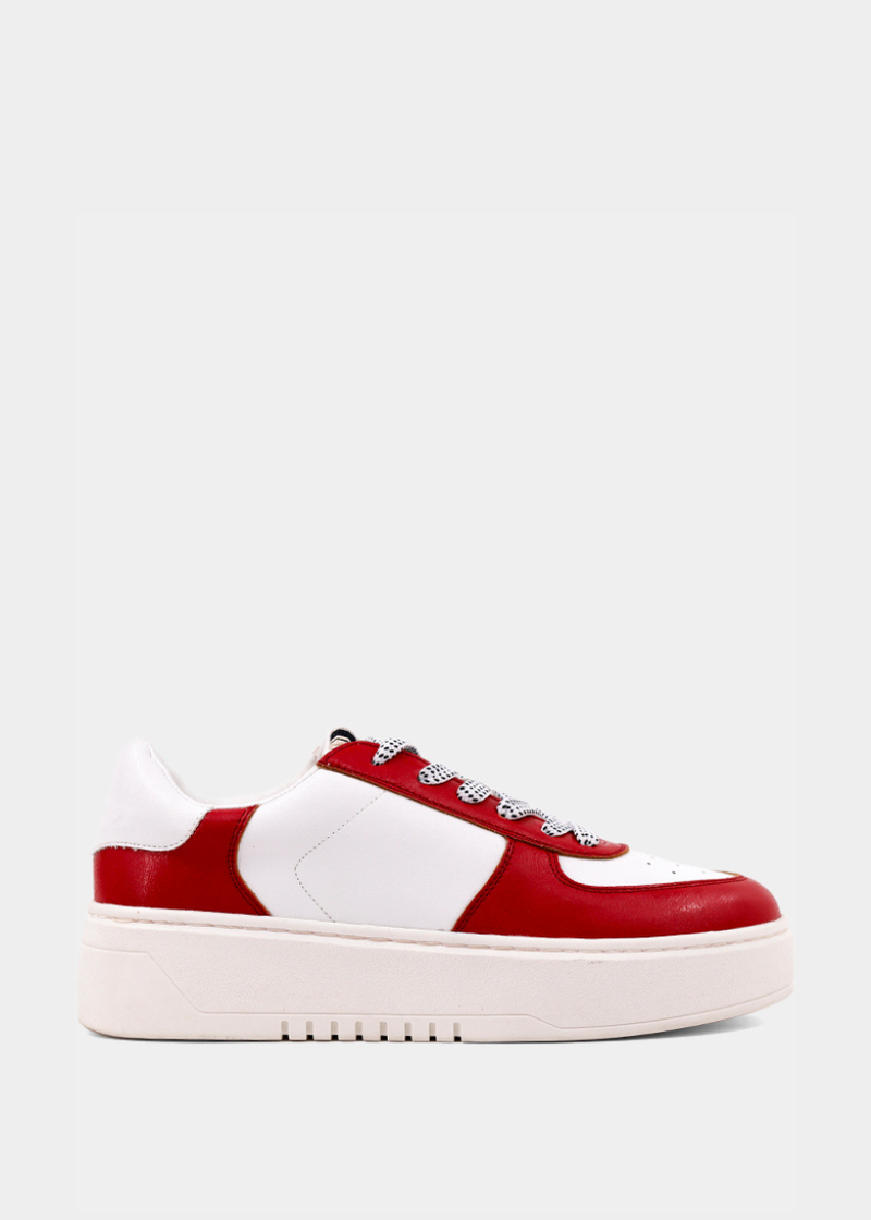 Elevate your style with our platform sneaker, SHIRLEY. Featuring a durable platform for support, this retro-inspired sneaker is crafted from ultra-soft metallic red and crsip white faux leather. Perfectly versatile, it pairs beautifully with skirts or tailored trousers, making it an essential addition to your wardrobe.