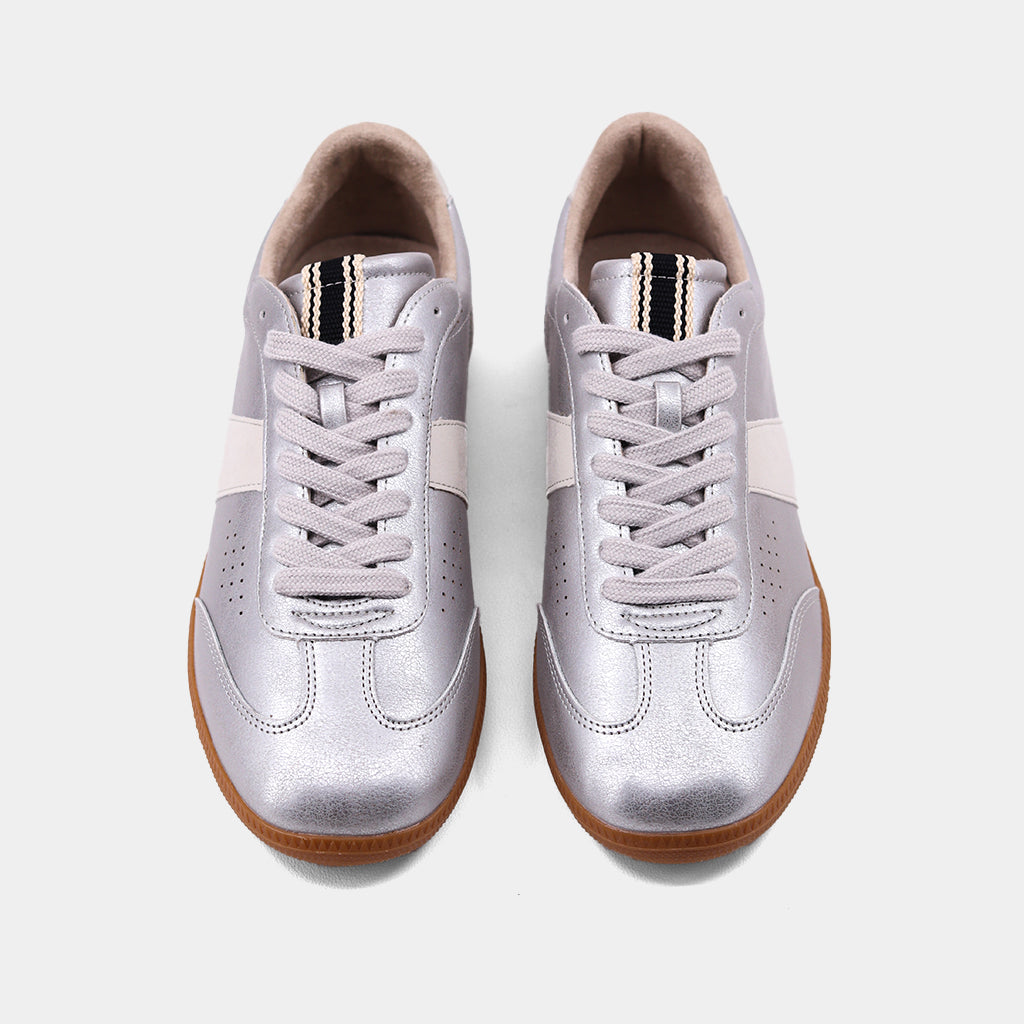 The SYDNEY sneakers blend retro charm with a modern edge. They are crafted from buttery faux metallic leather in a sophisticated sterling shade. The sleek body is accented with a subtle white-to-bone side stripe and ankle trim, creating a clean, contemporary look. The gum-colored rubber sole ensures comfort and durability for all-day wear, while the signature brand tag pendant adds a signature touch of style. With their minimalist yet bold design, the SYDNEY sneakers offer the perfect combination of practicality and high-end aesthetic for everyday wear.