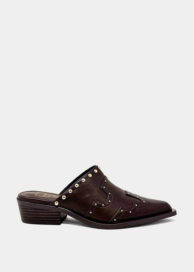 Western soul, city attitude. THALIA in Brown delivers the perfect blend of cowboy-inspired detailing and sleek mule style. With a pointed toe, embossed stitching, and golden studs, this slip-on is your shortcut to statement dressing-whether paired with denim, tailoring, or flowy fall dresses.