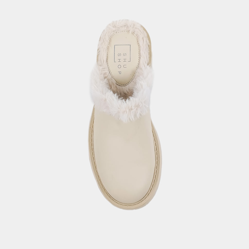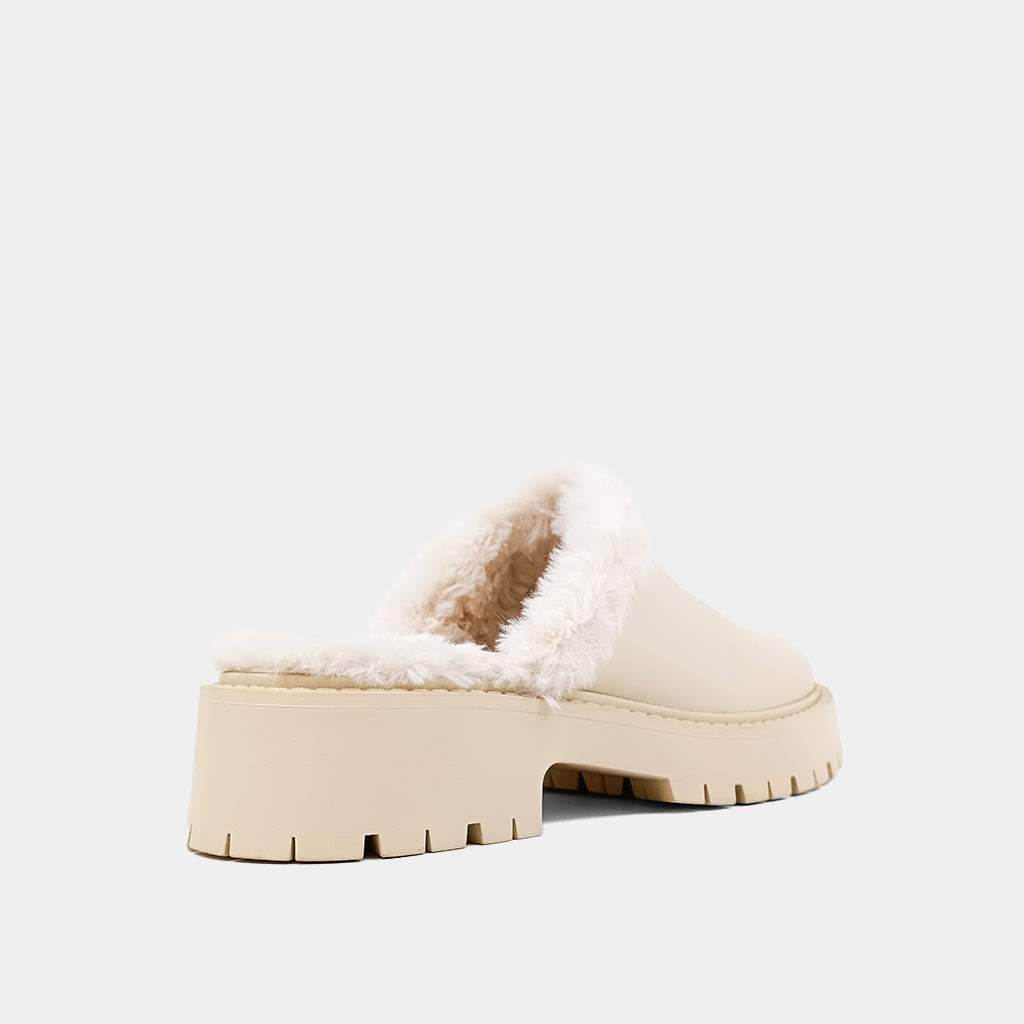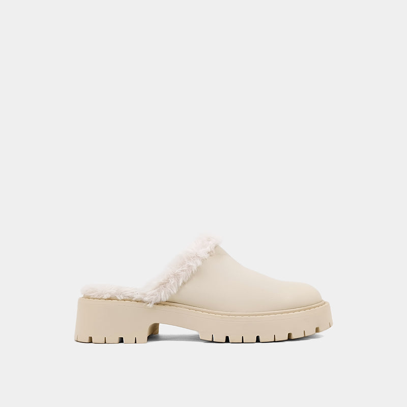 Elevate your casual style with these chic, faux-sherpa-lined mules. The smooth faux-leather exterior pairs beautifully with the soft sherpa detailing, creating a cozy yet refined look. Designed with a chunky, treaded sole for durability and a slip-on fit for ease, these mules offer the perfect blend of fashion and comfort ideal for everyday wear.