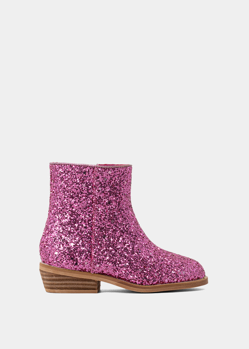 All pink, all sparkle, all hers. VANILLA MINI in Pink Glitter is pure joy wrapped in a boot. The bright fuchsia glitter upper, soft stacked heel, and zipper closure make it playful and practical for tiny fashion icons. It’s her new favorite party boot, even if the party is the grocery store.